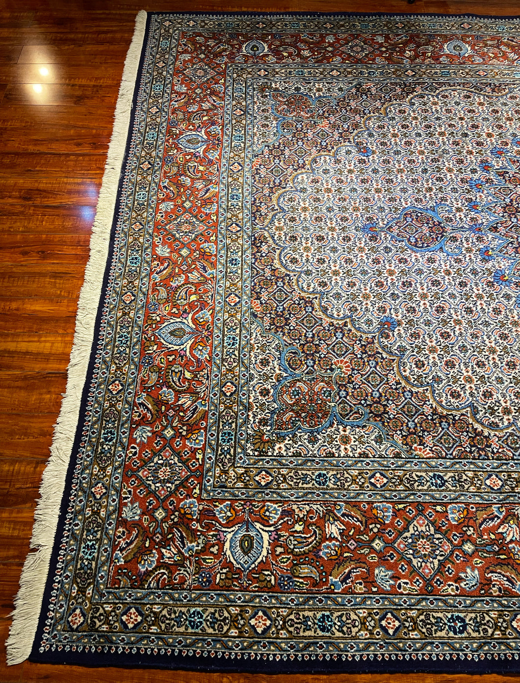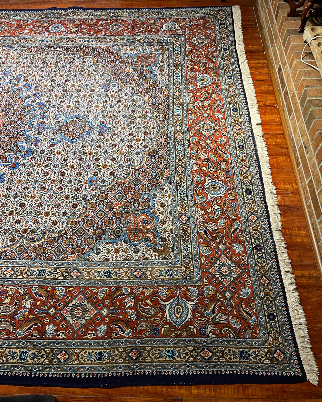 This rug has been Professionally cleaned, disinfected, and treated with natural cedar wood. This service ensures that the rug is clean, hypoallergenic, free from any pet and smoke odor, free from bacteria, and free from any Moths and Moth-eggs which will prevent any future outbreaks.
