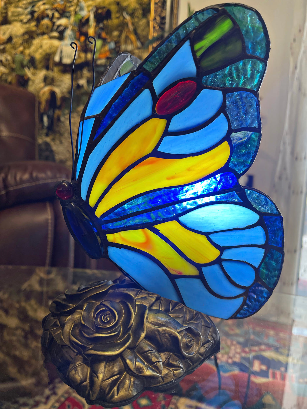 This exquisite Tiffany-style butterfly table lamp is a stunning blend of artistry and functionality, perfect for adding elegance to any space. Crafted with hand-cut stained glass pieces, the lamp features a beautiful butterfly design in shades of blue, green, red, and yellow, creating a warm and inviting glow when lit. The intricate pattern and vibrant colors evoke the charm of nature, making it a lovely statement piece for a living room, bedroom, or office. Sitting atop a detailed base, this lamp combines classic craftsmanship with timeless style, adding a touch of vintage sophistication to your décor. In Mint, Flawless condition. Clean.